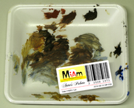 Artist's used Palette Piece of the "Artist's used collection" Ready-made Oil painting and acrylic on polystyrene tray, bar code label, variable dimensions Work in progress, available in the catalogue of the "Miam-manufacturing project" |
