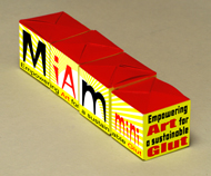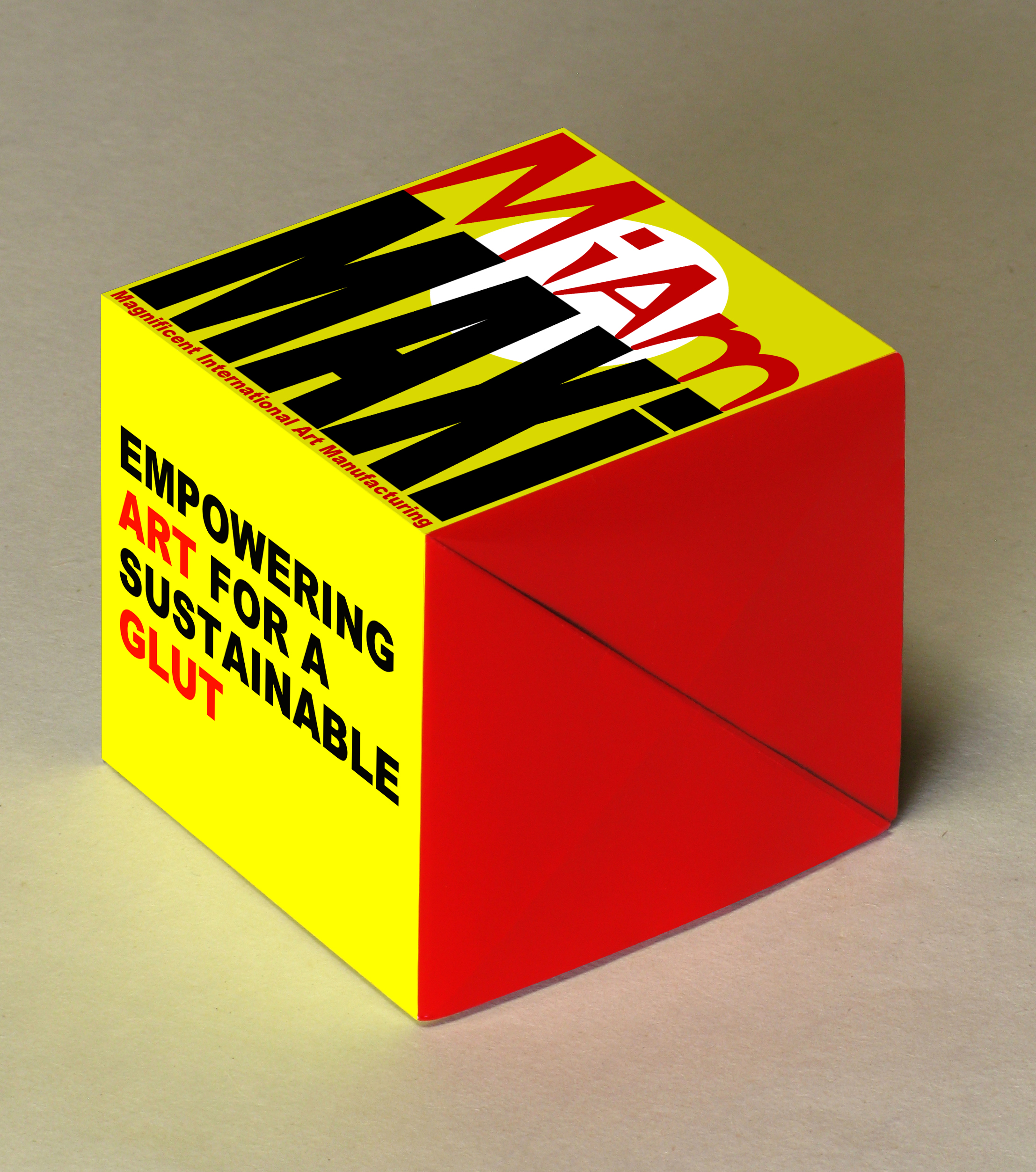Miam MAXI Empowering Art for a sustainable Glut Piece of the "Broken teeth collection" Ready-made Cement cube, wrapping printed paper, 7 x 7 x 7 cm Work in progress, available in the catalogue of the "Miam-manufacturing project" |
