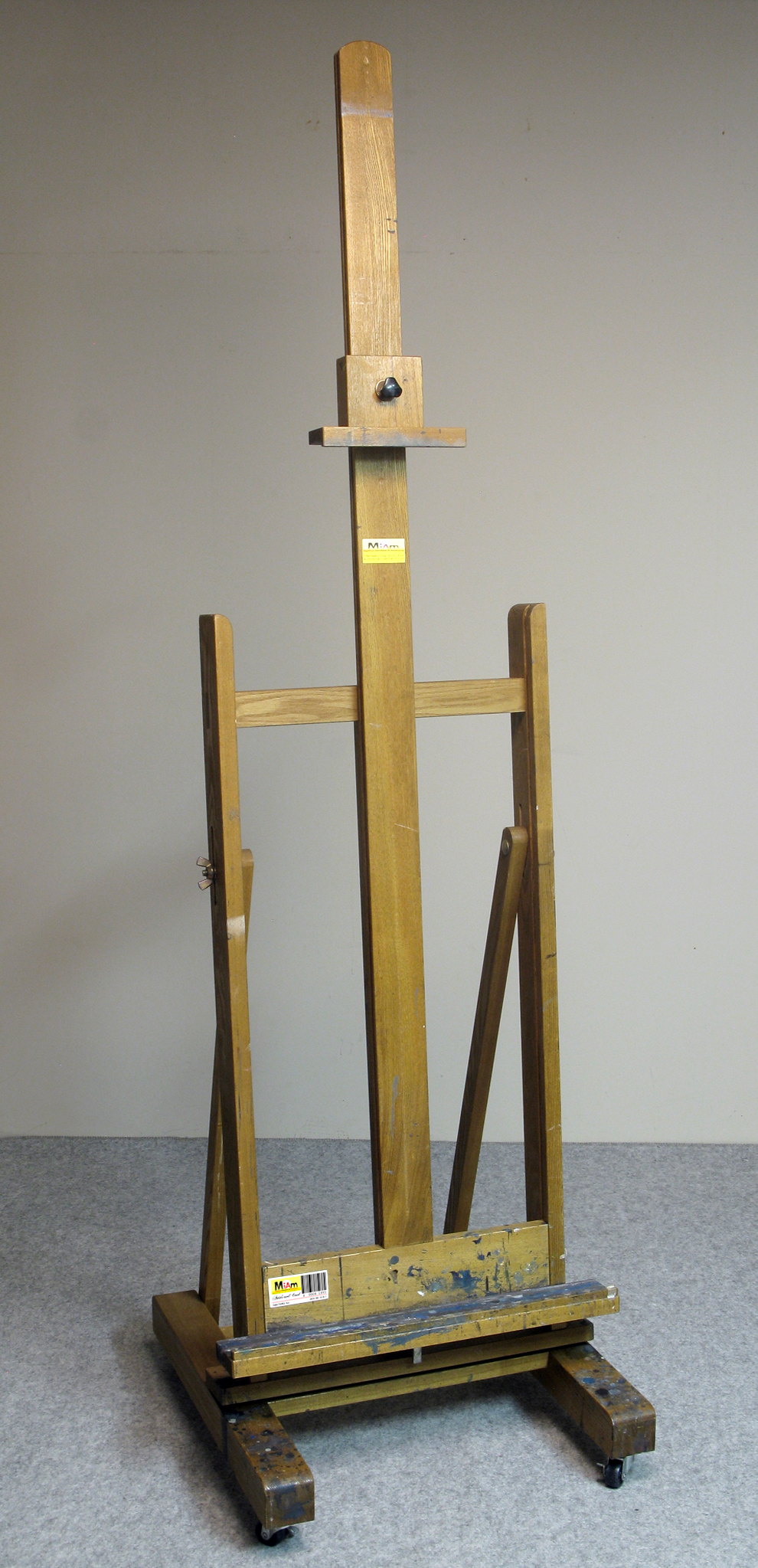 Artist's used Easel Piece of the "Artist's used collection" Ready-made Wood easel, bar code label, Height: 200 cm, Length: 57 cm, Width: 60 cm Work in progress, available in the catalogue of the "Miam-manufacturing project" |
