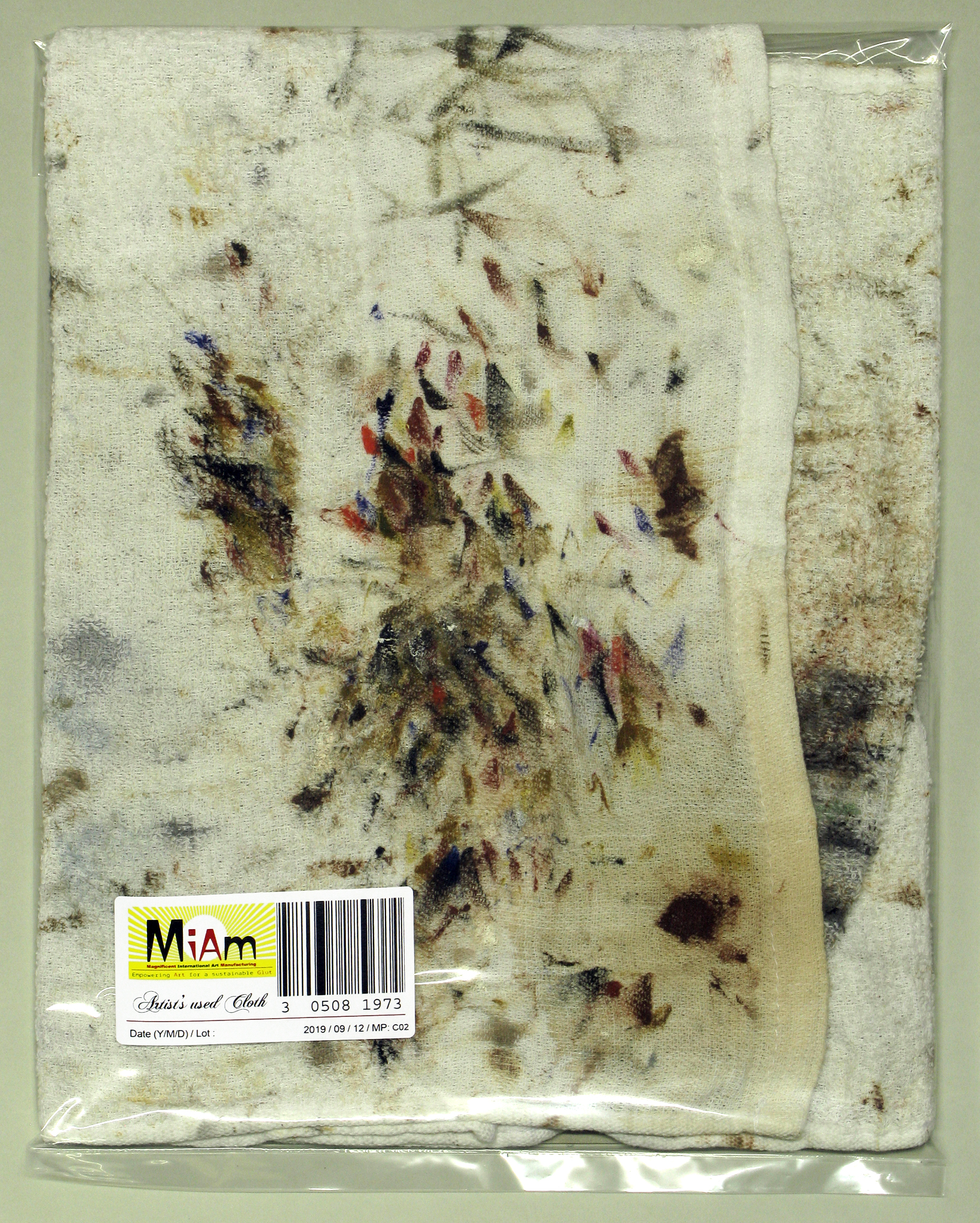 Artist's used Cloth Piece of the "Artist's used collection" Ready-made Oil painting on coton cloth packed into plastic sheet, bar code label, 25,2 x 32 cm Work in progress, available in the catalogue of the "Miam-manufacturing project" |