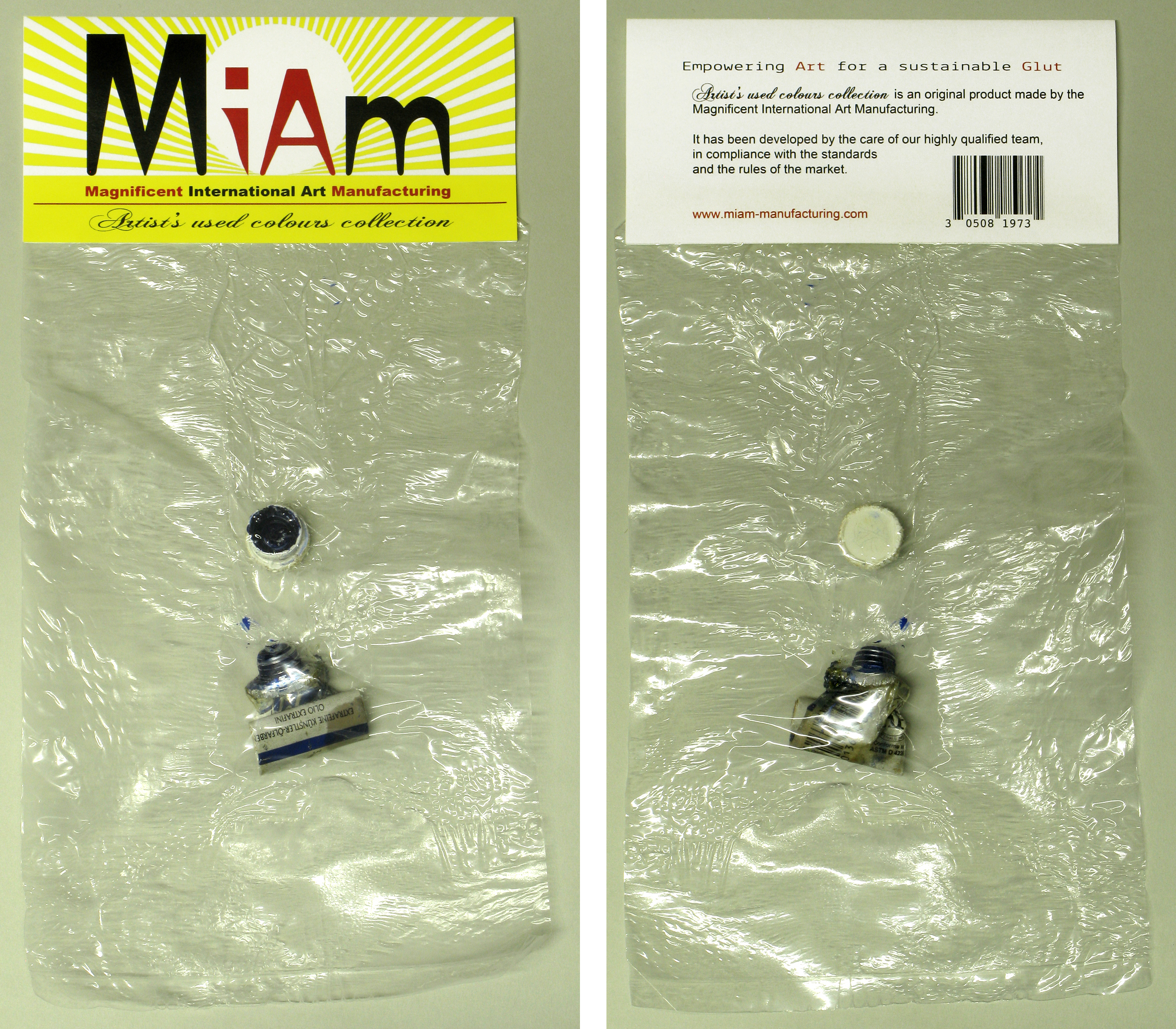 Artist's used Colours collection Piece of the "Artist's used collection" Ready-made Oil painting colour tube packed into plastic sheet, bar code label, variable dimensions Work in progress, available in the catalogue of the "Miam-manufacturing project" |