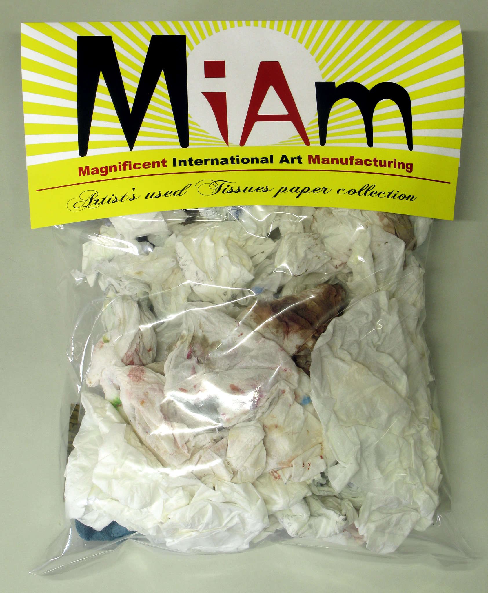 Artist's used Tissues paper collection Piece of the "Artist's used collection" Ready-made Tissues paper covered by oil and acrylic paint, variable dimensions Work in progress, available in the catalogue of the "Miam-manufacturing project" |
